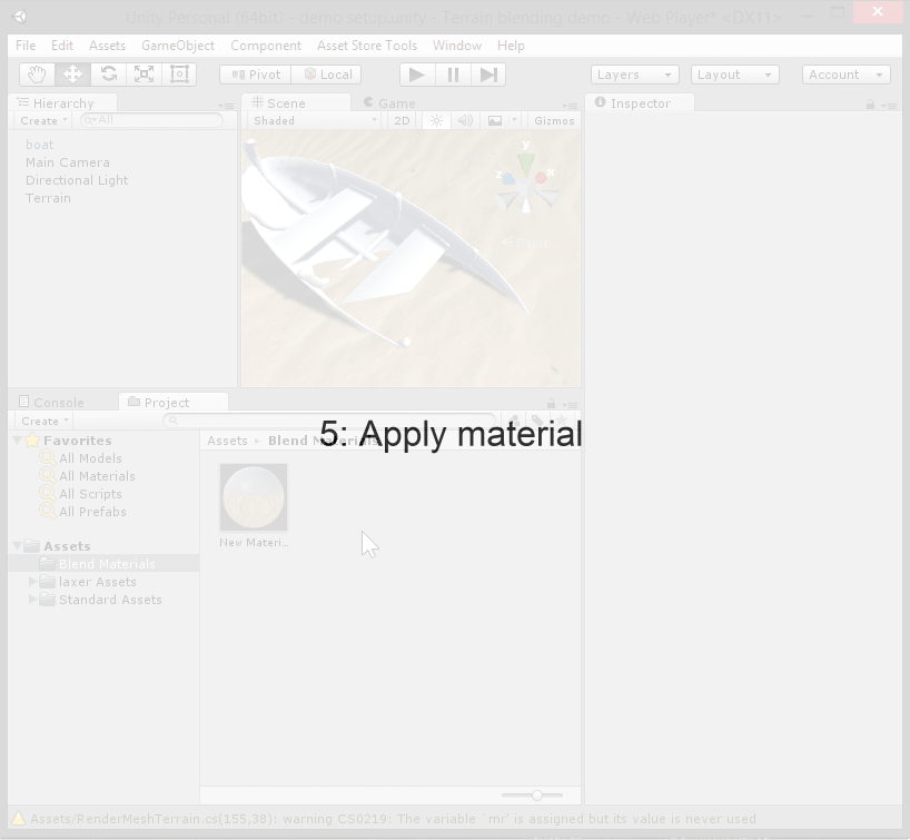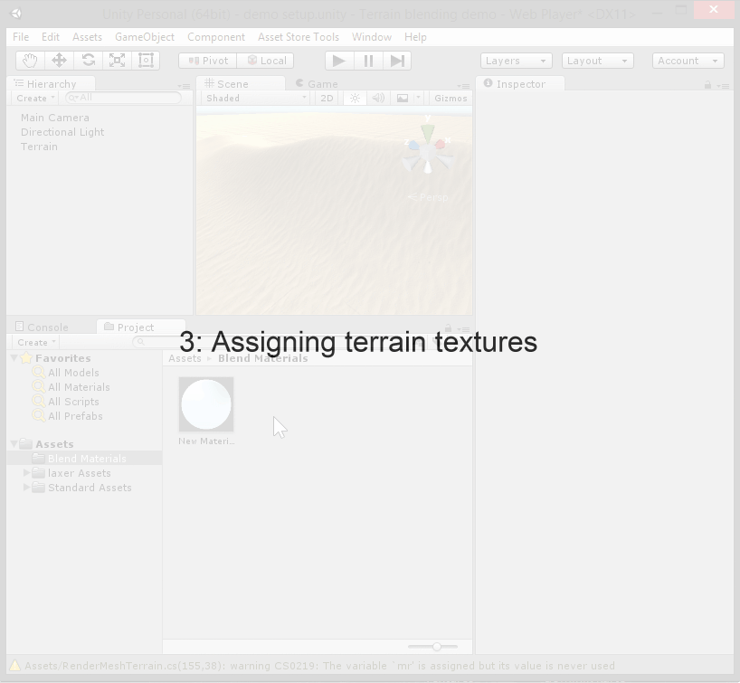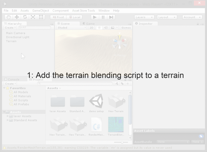 Here you will find information on how to use the terrain blending asset. This site uses animated .gif images to simplify the setup process. Please make sure, your browser supports this format.