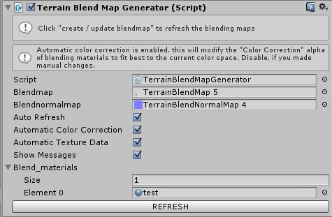 This makes the setup of terrain blending materials easier, since you only have to assign the correct terrain texture to the 'Terrain Texture' slot of each material. All other data will be updated automatically after clicking 'Refresh'.
