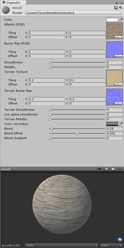 Blending only works with materials that use one of the included blending shaders.These are:- Custom/TerrainMeshBlend/Standard- Custom/TerrainMeshBlend/Standard Overlay- Custom/TerrainMeshBlend/Full Standard- Custom/TerrainMeshBlend/Legacy Diffuse- Custom/TerrainMeshBlend/Legacy Diffuse Overlay- Custom/TerrainMeshBlend/Legacy Specular- Custom/TerrainMeshBlend/Legacy Specular Overlay(It is possible to create custom shaders. A tutorial is included in the README.pdf, deferred shaders are not supported)To change the shader of a material use the dropdown 'Shader' at the top of the materials settingsEach blending material can blend with one texture of a terrain. All materials that should blend with a terrain have to be assigned to a list called 'Blend_Materials'. This list is part of the 'TerrainBlendMapGenerator' component. This component will automatically adjust all blending settings when clicking 'Refresh'. For more information see the 'Script' section.